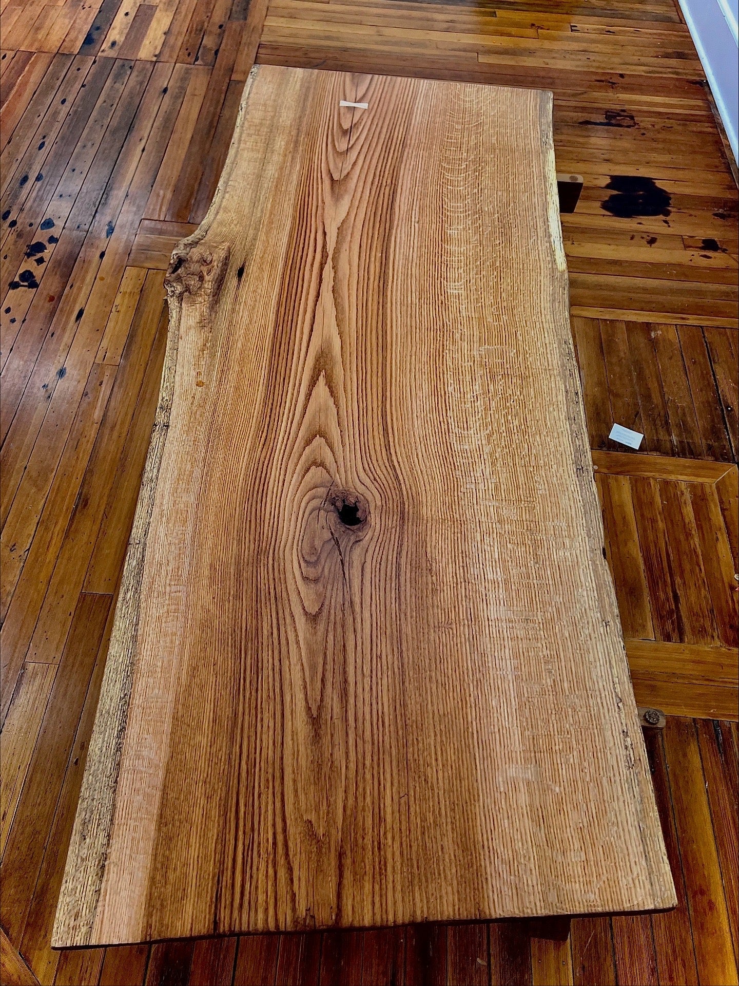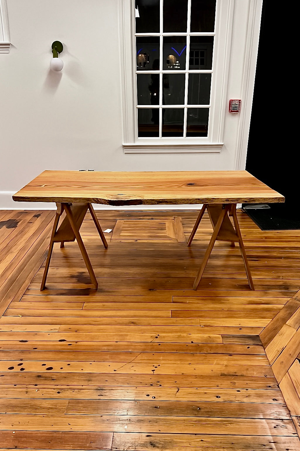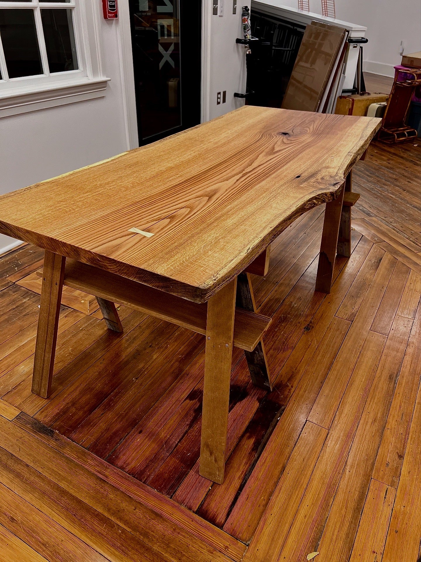 Live Edge Slab Table with a recycled barnwood sawhorse base.